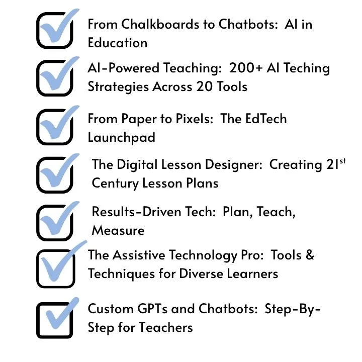 Whether you’re dipping your toes into educational technology or ready to dive headfirst into the world of AI-powered instruction, my online courses are designed to help you teach smarter, not harder — all while keeping students engaged, empowered, and excited to learn.